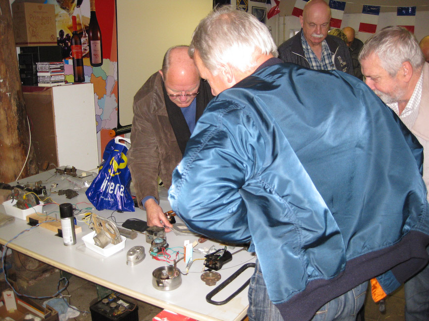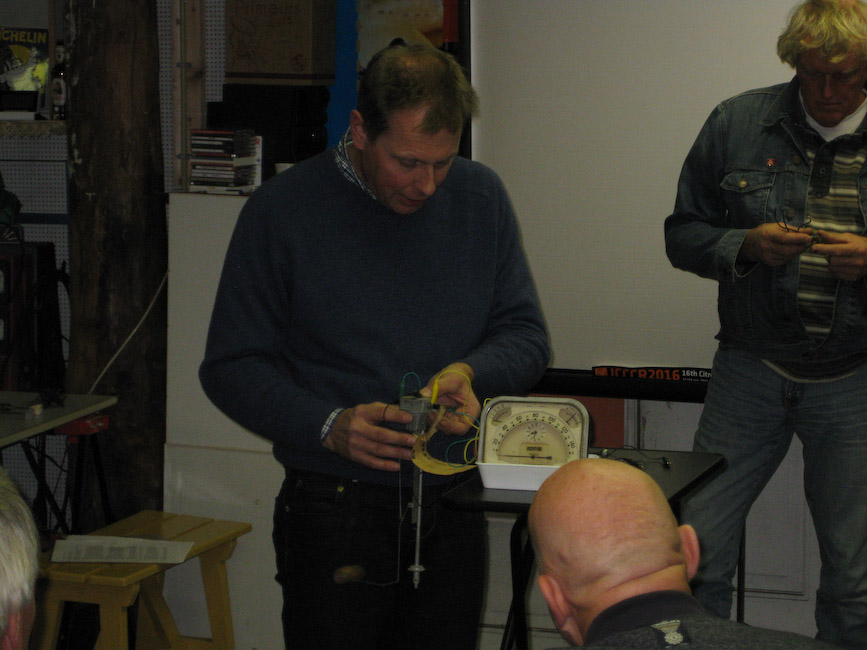 Gerrit legde vervolgens, na een pauze, de werking van de schakelaars en meters uit aan de hand van door leden bij elkaar gebrachte onderdelen, die de groep rondgingen.