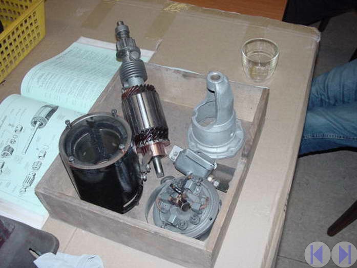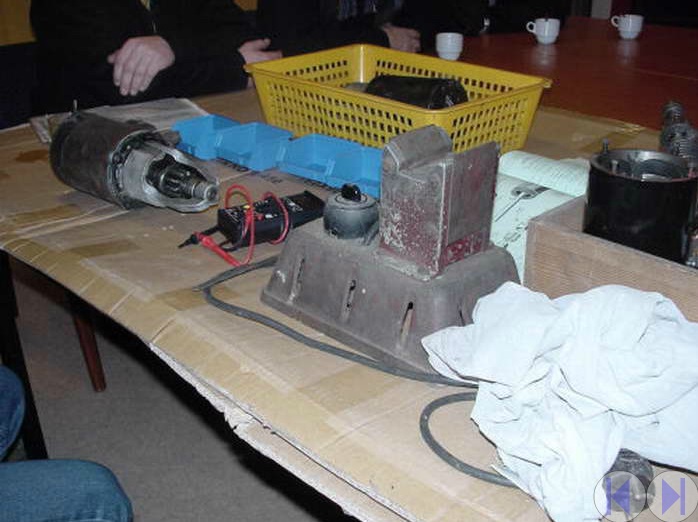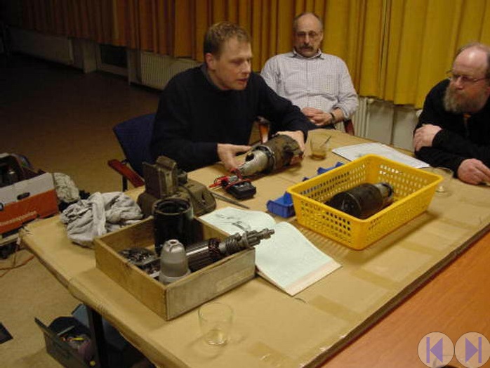 Ook hier bleek weer duidelijk dat elk type startmotor zijn eigen aanpak vereist. Veel aandacht werd besteed aan de goede werkwijze van het startrelais, de bendix en het reinigen van de ruimte tussen de ankers. Om de goede werking van de ankers te controleren had Gerrit een controle apparaat “brommer” uit zijn welgevuld museum meegenomen. Oude techniek werkt nog steeds !!!