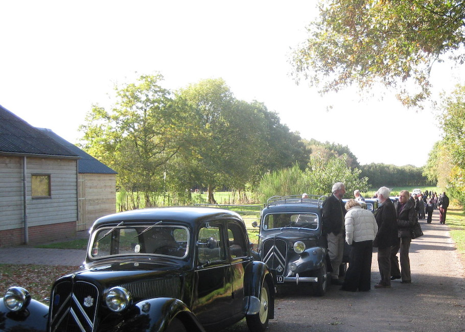 Na ruimschoots de tijd te hebben gehad om bij te kletsen, vertrokken we om 12:00 uur. Via Havelte, Uffelte, Rheebruggen en Ansen slingerde een lange rij Tractions naar het parkeerterrein van het bezoekerscentrum van het Dwingelderveld in Ruinen. Vandaar even de benen strekken; een korte wandeling naar de schaapskooi en een galerie en toen een bezoek aan het bezoekerscentrum zelf.