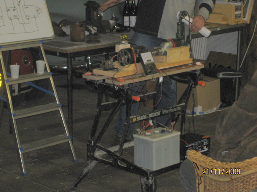 Gerrit legde daarna aan de hand van een schema en "levende" onderdelen de werking van het laadcircuit uit. Gelijkstroom- en wisselstroomdynamo, regelaar, etc. Er waren discussies over de voor en nadelen van de verschillende opties en over de mogelijkheid om te bouwen van 6V naar 12V, waarbij een grote meerderheid van de aanwezigen er toch de voorkeur aan leek te geven het systeem origineel te houden.