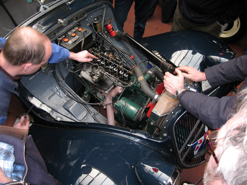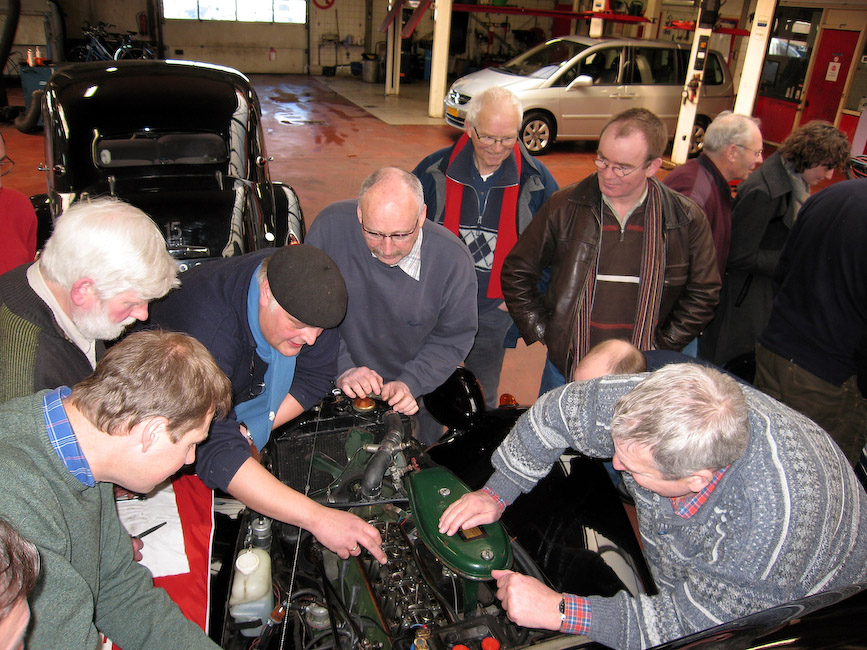 Mark en Gerrit hielden eerst een inleiding over de techniek, zijkleppen, kopkleppen, waarom speling en dat soort onderwerpen en na wat discussie met ervaringsdeskundigen gingen we aan de slag. Motorkappen eraf en de verzamelde menigte kon zich uitleven.
