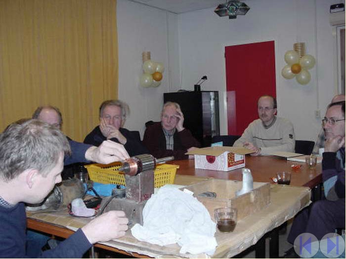 Ook hier bleek weer duidelijk dat elk type startmotor zijn eigen aanpak vereist. Veel aandacht werd besteed aan de goede werkwijze van het startrelais, de bendix en het reinigen van de ruimte tussen de ankers. Om de goede werking van de ankers te controleren had Gerrit een controle apparaat “brommer” uit zijn welgevuld museum meegenomen. Oude techniek werkt nog steeds !!!