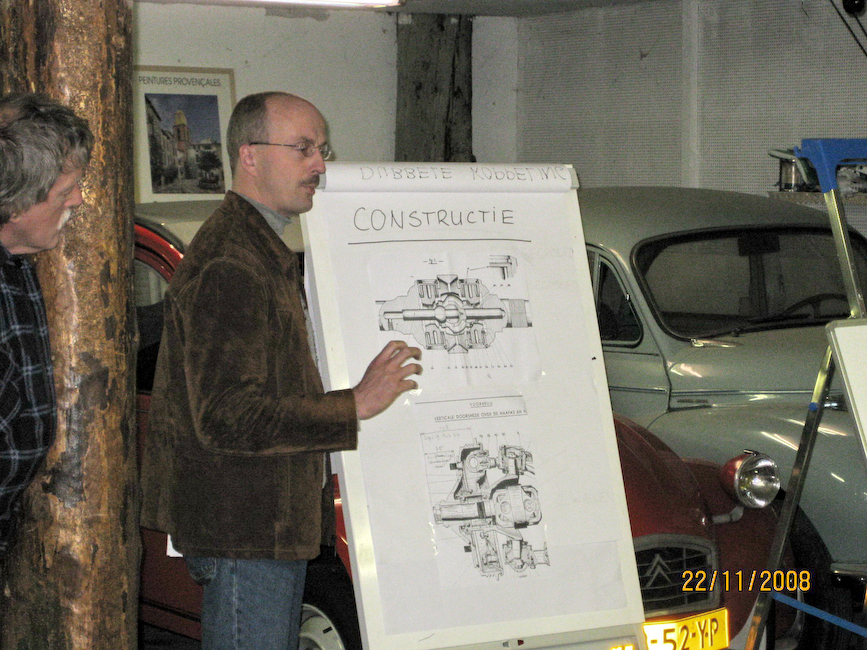Aan de hand van tekeningen en "levende" voorbeelden legden Mark en Gerrit de werking van de aandrijfas, de kruis- (cardan) koppelingen en de homokinetische koppelingen uit, daarbij geholpen door ervaringsdeskundigen uit het publiek. Dany gaf daarna nog een uitleg over het demonteren en monteren.