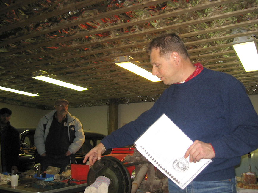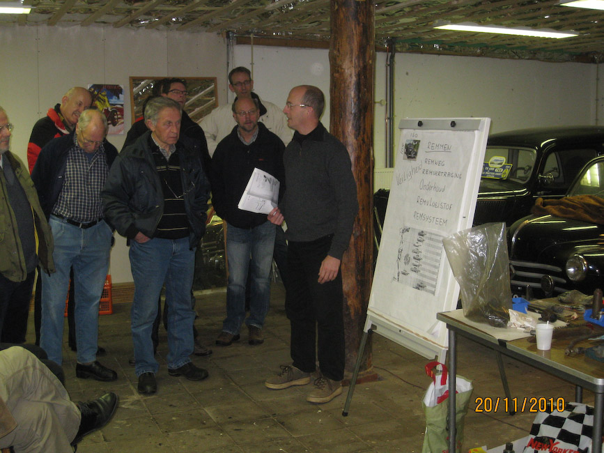 Daarna behandelde Gerrit de constructie van het remsysteem. Zowel het mechanische gedeelte, de remschoenen met de voering, de remtrommels, als de hydraulische bediening werden behandeld. De verschillende soorten remvloeistof, corrosie als gevolg van water in de remvloeistof, het kwam allemaal aan de orde. En ook de reparatie van als deze onderdelen werd behandeld, inclusief het gebruik van de rempasser en het ontluchten van het hydraulische systeem. Natuurlijk leverde het onderwerp weer de nodige discussies op van de ervaringsdeskundigen.