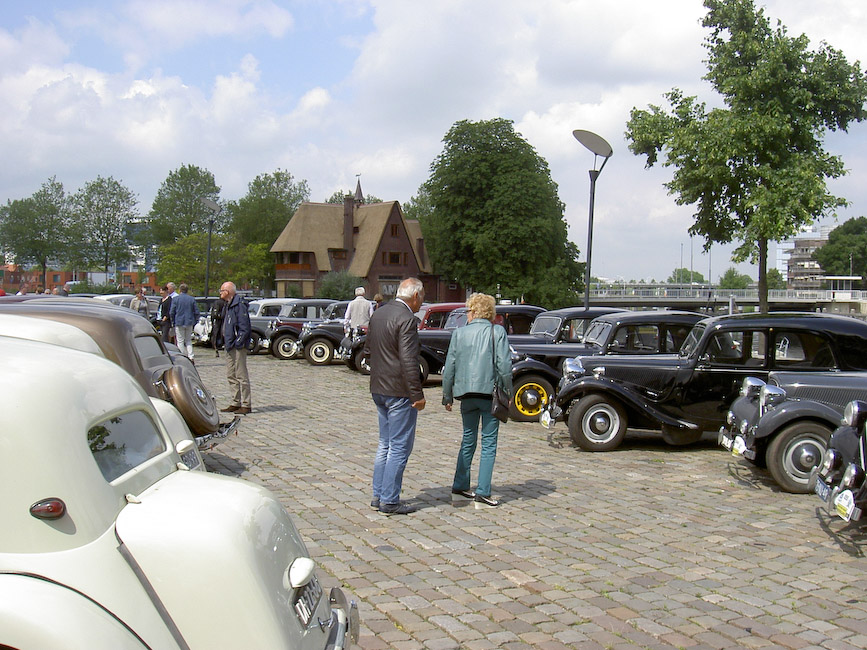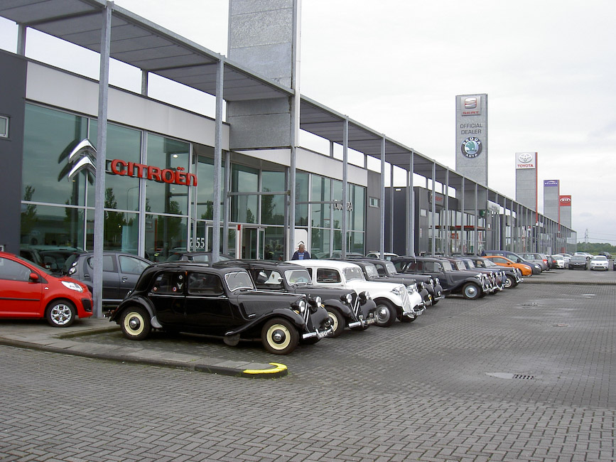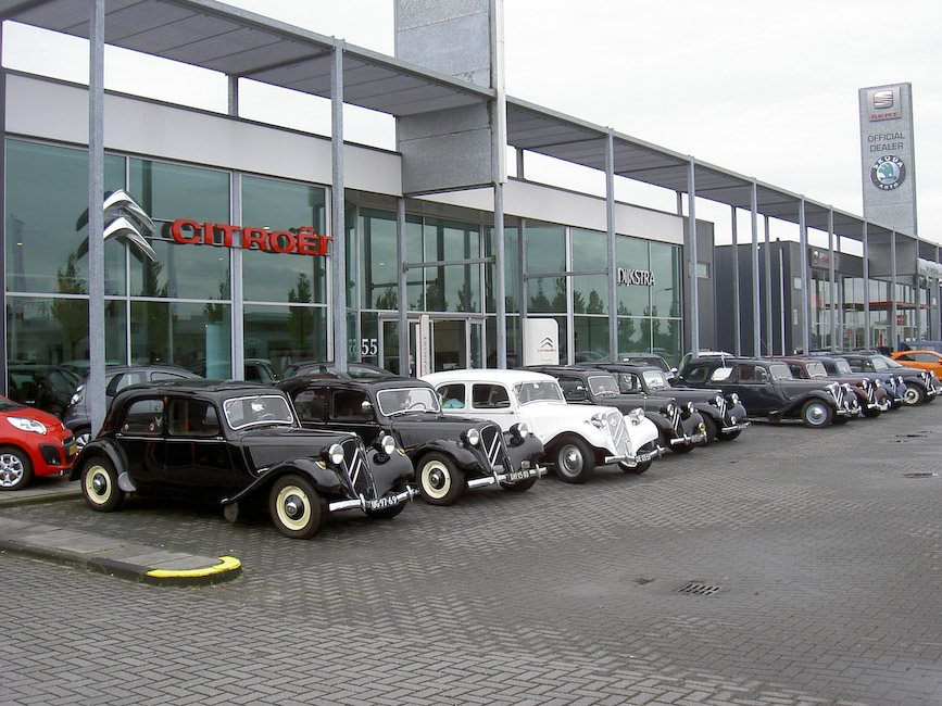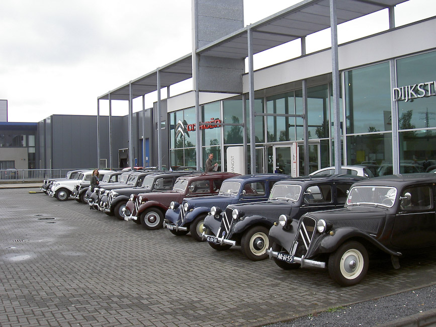 Voor het deelnemen aan de jubileum activiteiten hadden zich 22 equipes uit Noord opgegeven. Door de ritmeesters Mark Hermsen en Joop Posthumus waren twee aanlooproutes richting Koekange uitgezet. Dus zaten er rond de klok van 10 op Hemelvaartsdag 12 Tractionleden aan de koffie met koek bij Citroen Dijkstra Oudehaske die daarvoor speciaal haar showroom beschikbaar had gesteld. Op hetzelfde tijdstip zaten 10 Traction eigenaren met aanhang bij Hofsteenge in Rolde aan de koffie met gebak. Na al dit lekkers vertrokken beide groepen via een mooie route naar Koekange, waar Tractionspecialist Arjen Antonisse samen met zijn vrouw Feikje en familie een lunch zou aanbieden. In de showroom en de werkplaats stonden volop lekker belegde broodjes en huisgemaakte soepen voor ons klaar. De deelnemers lieten zich het aangebodene heerlijk smaken alvorens de rit naar de jubileumlocatie in Epe werd aangevangen. Familie Antonisse heel hartelijk dank voor de vorstelijke ontvangst! Mark en Joop hadden vanuit Koekange weer een mooie rit uitgezet die het gezelschap zonder kleerscheuren in Epe bracht. Voor het verslag van het jubileumfeest zelf kunt u kijken op de clubsite www.traction-avant.nl