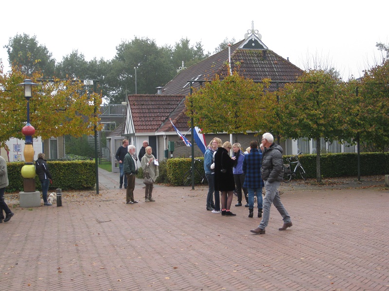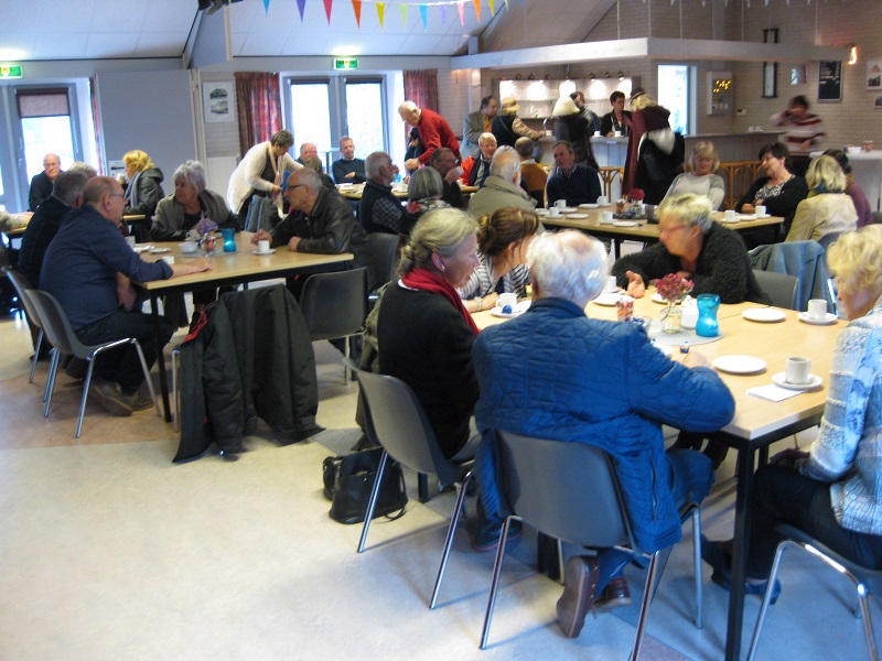 De eigenaren en hun gezelschap deden zich binnen te goed aan koffie met cake terwijl de dorpelingen, gewaarschuwd door een bericht op Facebook, 21 mooie auto's bewonderden. Hoewel menigeen onderweg naar Rottum mist of regen had ondervonden, kwam toen we aan de rit begonnen de zon door en die is ons de rest van de dag goed gezind geweest. Na een poosje rijden kwamen we bij het bezoekerscentrum van De Weerribben aan, waar we konden lunchen of buiten van het moooie weer genieten.