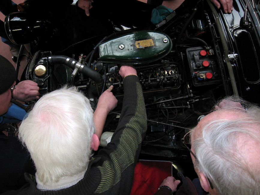 Mark en Gerrit hielden eerst een inleiding over de techniek, zijkleppen, kopkleppen, waarom speling en dat soort onderwerpen en na wat discussie met ervaringsdeskundigen gingen we aan de slag. Motorkappen eraf en de verzamelde menigte kon zich uitleven.