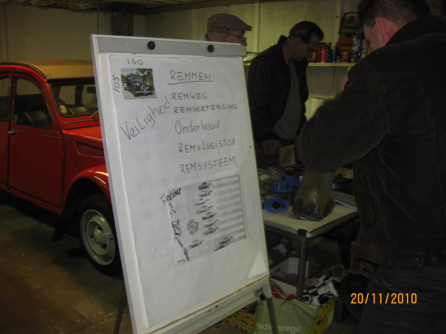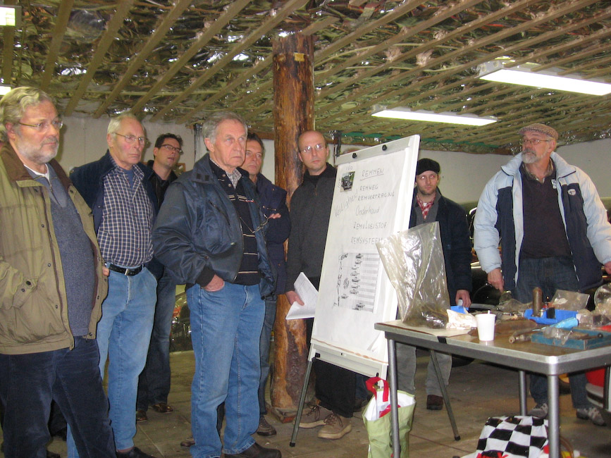 Daarna behandelde Gerrit de constructie van het remsysteem. Zowel het mechanische gedeelte, de remschoenen met de voering, de remtrommels, als de hydraulische bediening werden behandeld. De verschillende soorten remvloeistof, corrosie als gevolg van water in de remvloeistof, het kwam allemaal aan de orde. En ook de reparatie van als deze onderdelen werd behandeld, inclusief het gebruik van de rempasser en het ontluchten van het hydraulische systeem. Natuurlijk leverde het onderwerp weer de nodige discussies op van de ervaringsdeskundigen.