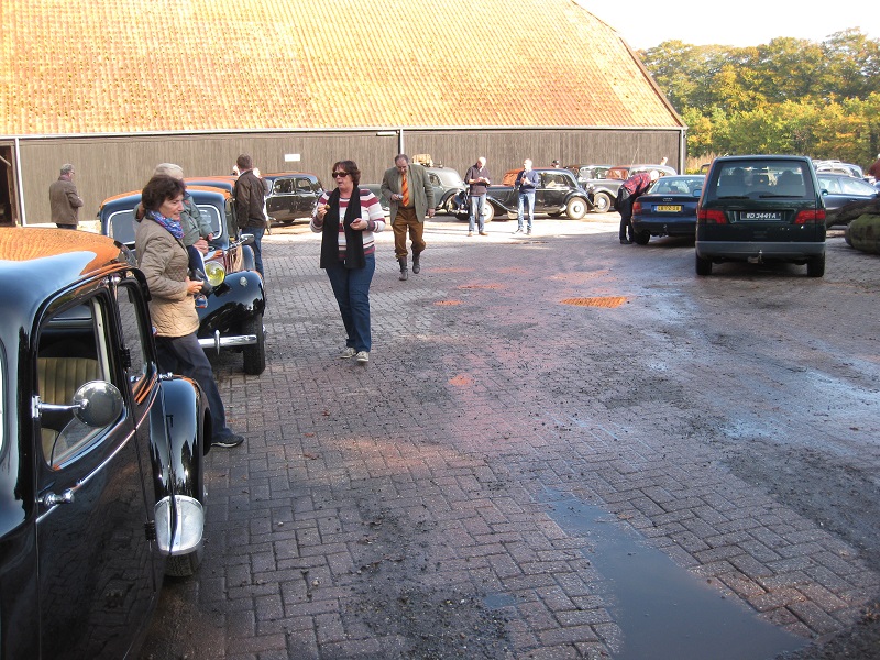 De eigenaren en hun gezelschap deden zich binnen te goed aan koffie met cake terwijl de dorpelingen, gewaarschuwd door een bericht op Facebook, 21 mooie auto's bewonderden. Hoewel menigeen onderweg naar Rottum mist of regen had ondervonden, kwam toen we aan de rit begonnen de zon door en die is ons de rest van de dag goed gezind geweest. Na een poosje rijden kwamen we bij het bezoekerscentrum van De Weerribben aan, waar we konden lunchen of buiten van het moooie weer genieten.